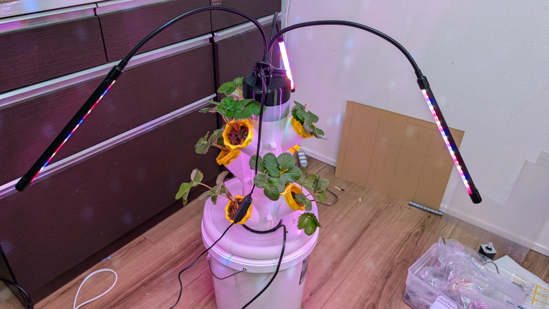 このバータイプのLEDは植物体から10cmぐらいの位置まで近づけると3000Luxにはなる。調べるとイチゴを元気に栽培するには3000Luxぐらいあった方が良さそうなので、とりあえず消費電力100Wを目指して増設予定。