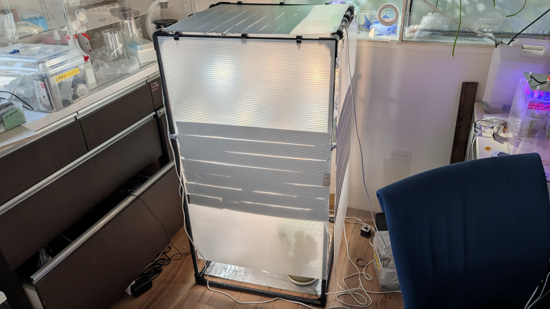 ハウジングの外見のこんな感じ。ホームセンターで買ってきた2m×1mで400円のプラダンにダイソーのアルミテープを張る。