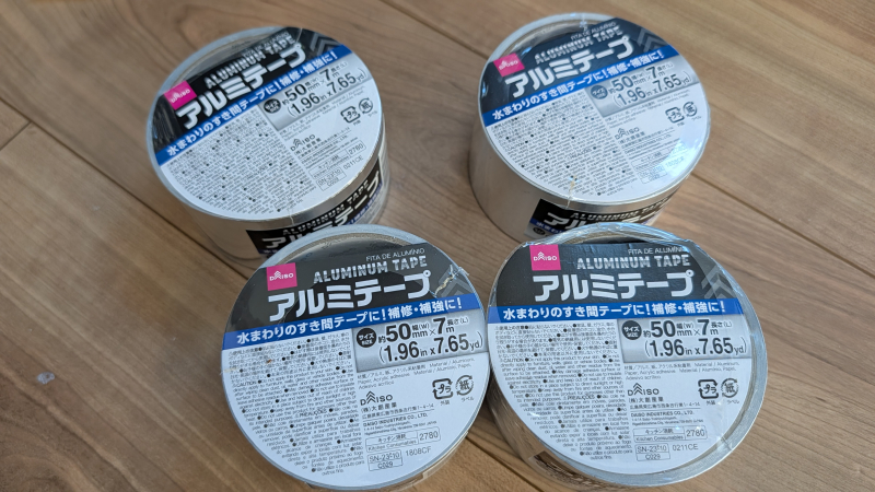 ↓ダイソーのアルミテープ。50mm×7mmで110円。5ロールほど使用。もっと節約したければダイソーのアルミホイルを張り付けるともっと安く出来る。