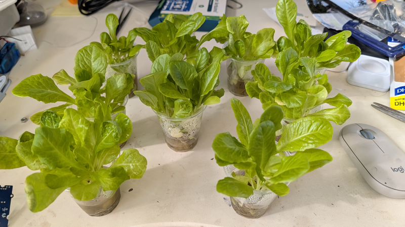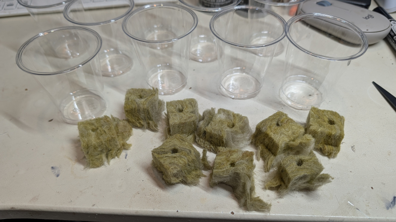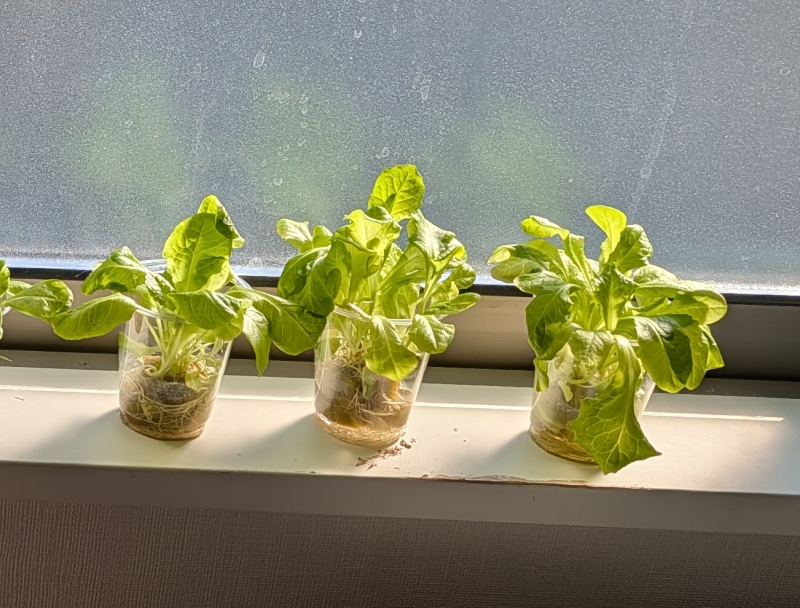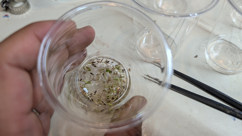 ↓2025年12月3日の状態。種はダイソーで売っていた2袋100円のサラダ菜ミックスです。ダイソーで売っている一番小さい90mL容量の使い捨てプラカップに入れて、ハイポニカ500倍の液肥入りの水で発芽。