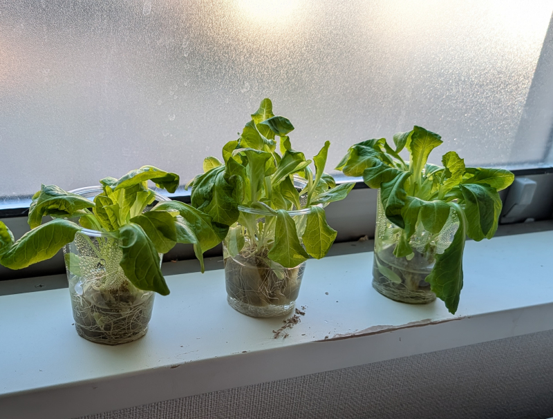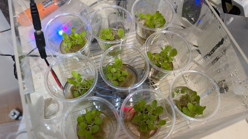 ↓密閉容器の中のような湿度100%で育てたサラダ菜は超ふにゃふにゃです。外に出すと乾燥でいったんしおれそうになりますが