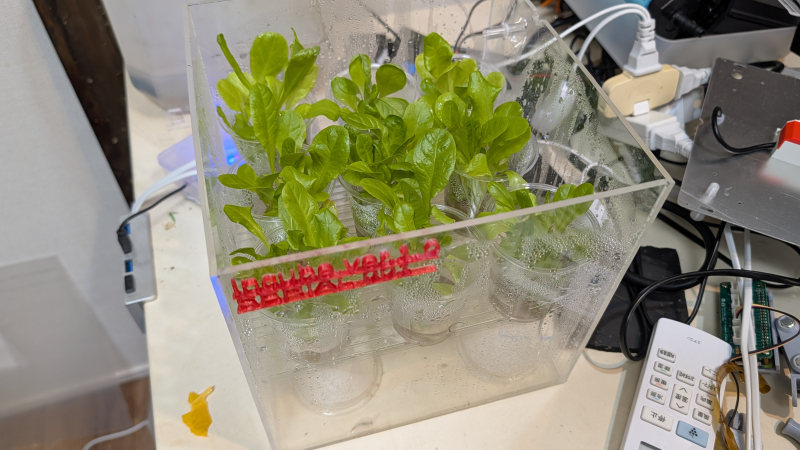 これは大人1人の2日分ぐらいの野菜と言えるでしょうか?20cm四方のキューブは部屋に縦方向に10個、畳1枚分の広さに300個置けるはずなので、畳1枚分の広さと電気があれば大人20人が生きていくのに必要な野菜は生産出来るってことでOK?一畳分の生産スペースで人間は自給自足出来るか?とか面白いテーマだなぁ