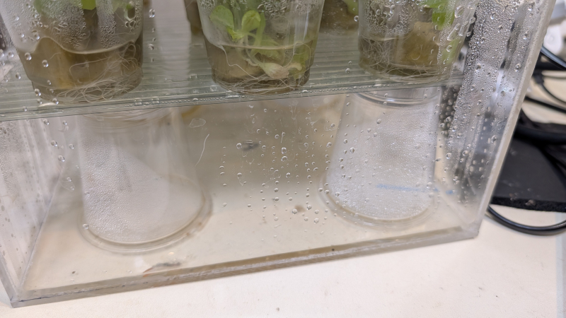 ↓密閉容器で育てると水が蒸発しないので水替え不要でよいのですが、まわりが寒いため容器の周囲で結露した水が底にたまってきて美しくないですね。排水機構が必要かも。