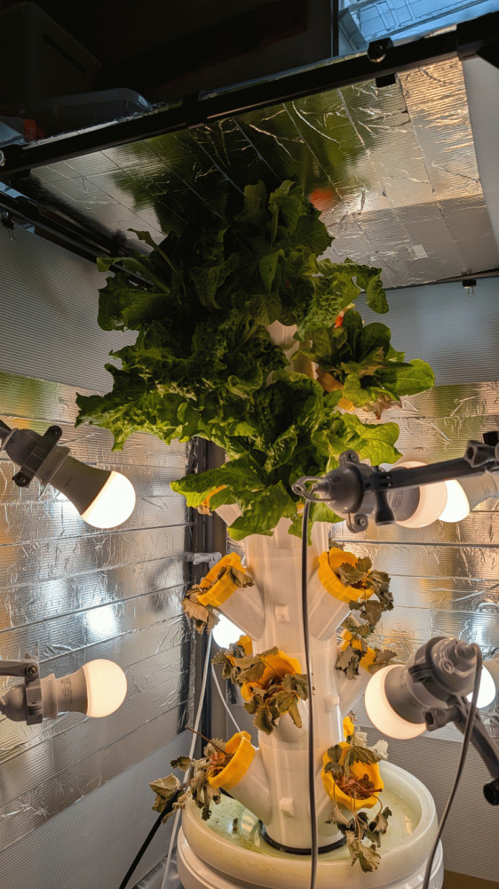 1か月ほど前にポンプが壊れていたのを直した時に縦に増設して種から人工光のみで40日栽培したサラダ菜を追加して、子供の受験もあり放置していたのですが見てみたら元気よく育ち過ぎてた。種から人工光のみで70日目って感じ。