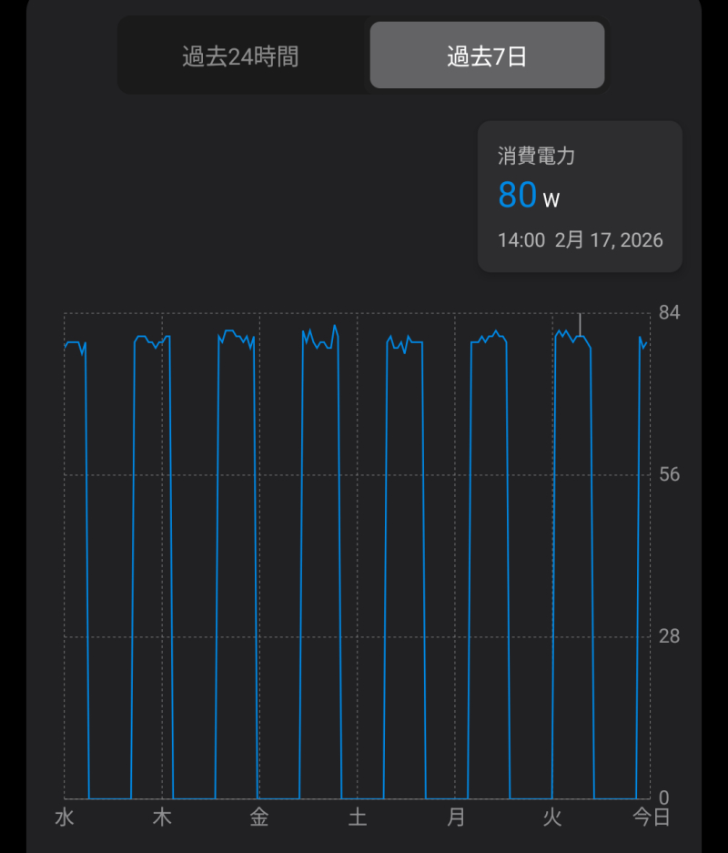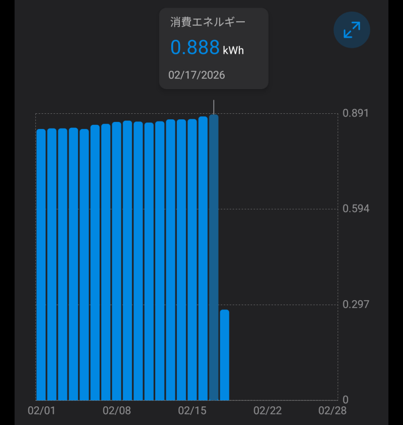 ↓消費電力は1日0.9kWh弱、じわじわ増えているのは徐々に日の出から日の入りの時間が伸びているためと思われます。1日あたりの電気代は30円程度でしょうか。月間電気代1000円弱。