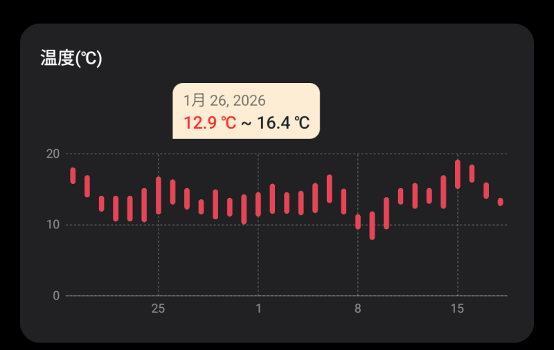 ↓温度推移です。たまにエアコンをONすることはあるけど基本的にはエアコン無しの室内で12度〜16度ぐらいだったようです。