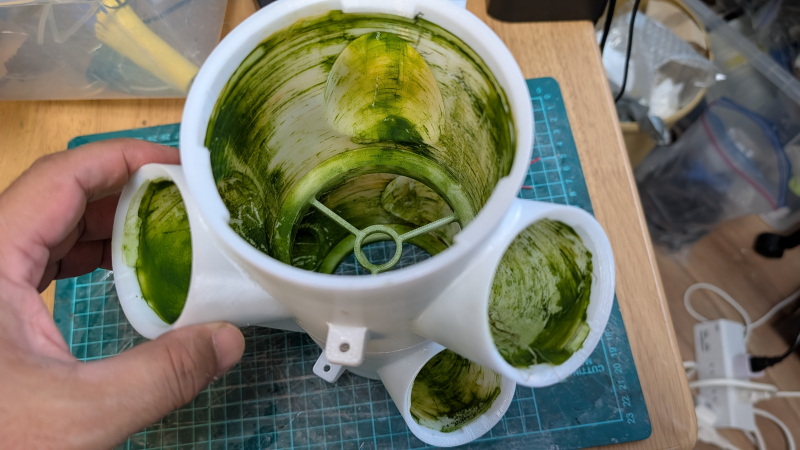 モジュールを全部バラして清掃しました。内部は藻でびっしり。完全人工光栽培でもこんなに藻が生えてしまうのですね。。。。藻に栄養吸われてしまうので藻の抑制対策はしたいところです。掃除も大変だし。