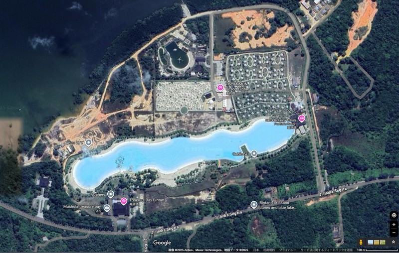 下記はGoogleマップ、人工ラグーンの右端にあるピンクのポイントが今回宿泊しているホテルです。他にもピンク色のポイントが確認出来ると思いますが、人工ラグーンの周囲には他に2つのホテルがあります。