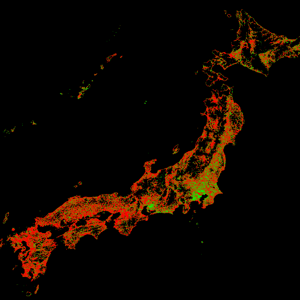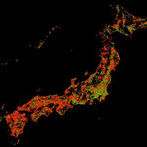 平成17年度国勢調査のデータを元に、1km四方ごとに男性が多い地域を緑、女性が多い地域を赤で示してみました。